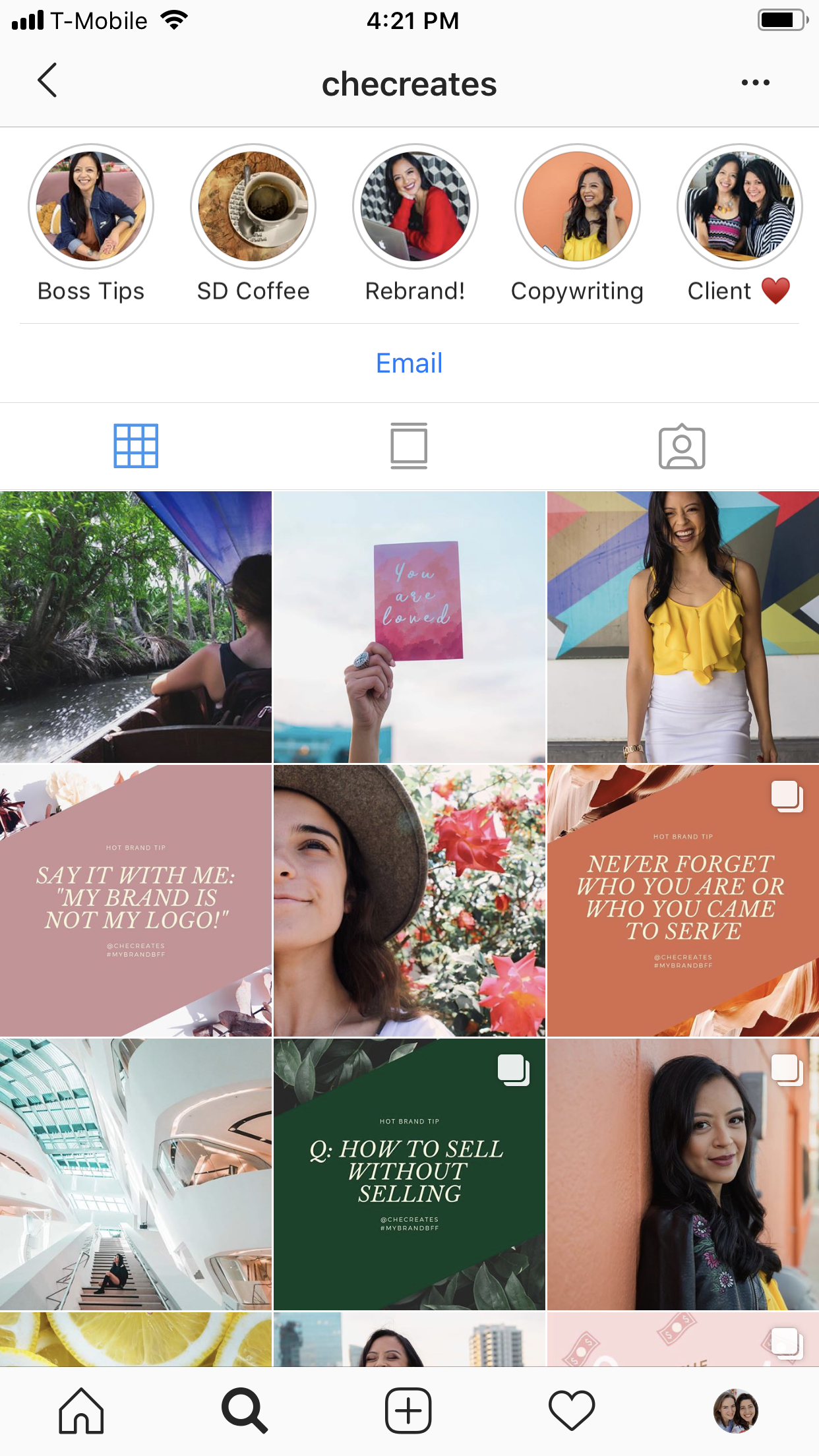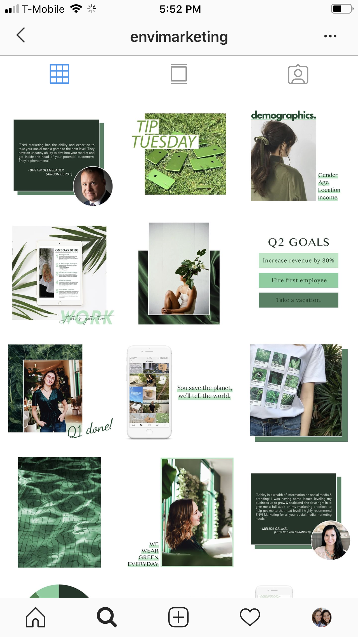 The Envi Marketing profile can be described as less of a grid pattern and more of an overall aesthetic. Ashely has capitalized on using white space in each post which separates her brand’s profile from millions of others on the platform. She has also clearly communicated her brand color palette by using dazzling shades of green throughout the grid. Most importantly, she has expertly conveyed what her brand does: if you work with Envi, you know they are going to elevate your design and transform your social media presence. I told you I was fan-girling, don’t judge!